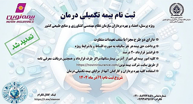 تمدید مهلت ثبت نام بیمه تکمیلی درمان سال ۱۴۰۵-۱۴۰۴ توسط صندوق تعاون و رفاه سازمان نظام مهندسی کشاورزی و منابع طبیعی کشور