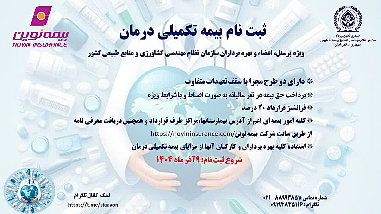 به اطلاع اعضاء، عوامل فنی، بهره‌برداران و پرسنل محترم سازمان نظام مهندسی کشاورزی و منابع طبیعی استان اصفهان می‌رساند: ثبت نام بیمه تکمیلی درمان ۱۴۰۵-۱۴۰۴ از روز یکشنبه مورخ ۹ آذر ۱۴۰۴ آغاز شده‌است.